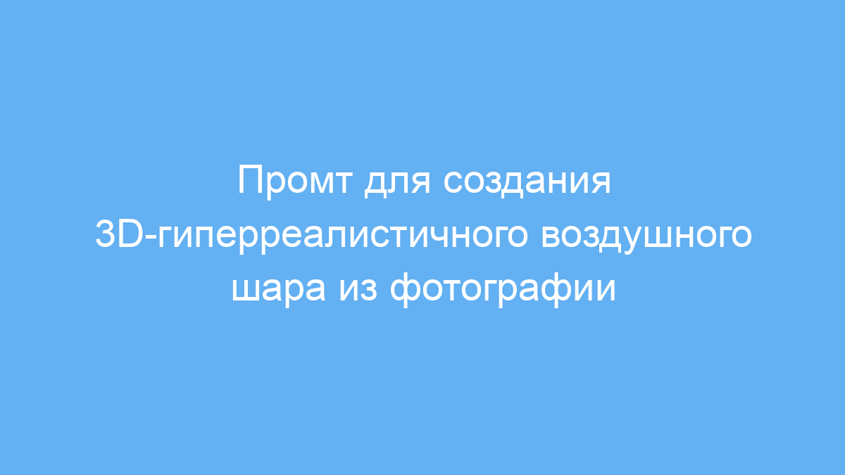 Этот промт предназначен для пользователей нейросетей, желающих преобразовать обычную фотографию в оригинальное 3D-изображение в виде гиперреалистичного воздушного шара. Он сохраняет основные черты лица или объекта, но придаёт изображению эффект надувного шара в стиле сюрреализма. Такой приём решает задачи создания необычного визуального контента для дизайна, рекламы, арт-проектов или развлекательных материалов.
