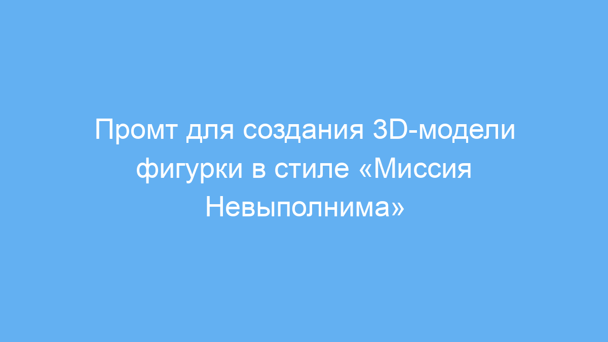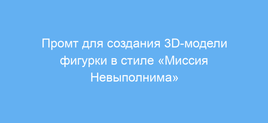 Этот промт предназначен для художников, дизайнеров и любителей 3D-графики, которые хотят быстро получить готовую 3D-модель фигурки на основе фотографии. Особенность промта — создание пластиковой мини-фигурки персонажа Итана Ханта с аутентичным антуражем в стиле «Миссия Невыполнима».