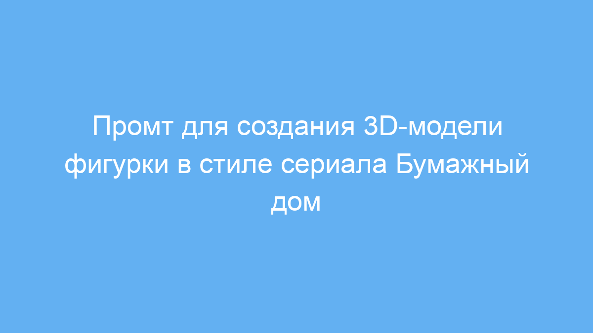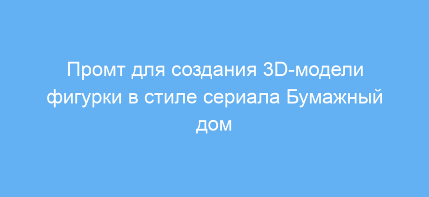 Промт решает задачи по быстрому прототипированию и подготовке концепт-артов для сувениров или коллекционных фигурок, особенно если нужно подчеркнуть стилистику популярного сериала «Бумажный дом» — с узнаваемой маской, красным комбинезоном и другими атрибутами.