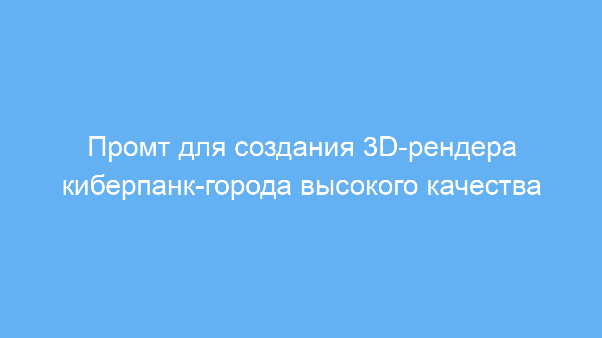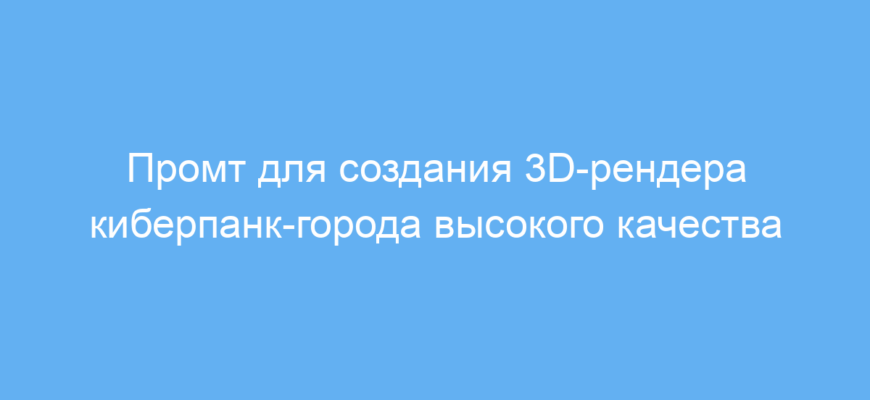 Использование данного промта позволяет быстро и легко создавать эффектные 3D-изображения киберпанк-города высокого качества. Он сокращает время на подготовку визуального материала и помогает получить профессиональный результат даже без глубоких знаний в 3D-моделировании или графическом дизайне.