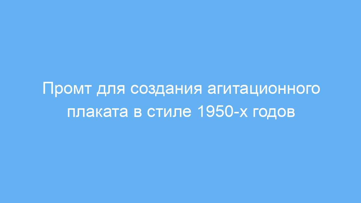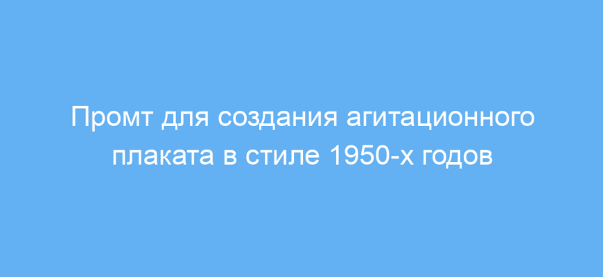 Этот промт предназначен для дизайнеров, маркетологов, студентов и всех, кто хочет быстро сгенерировать яркий агитационный плакат в ретро-стиле 1950-х годов с конкретным посланием. Он поможет быстро получить визуальное оформление с заданным лозунгом и ключевыми элементами, что значительно экономит время и усилия по созданию дизайна с нуля.