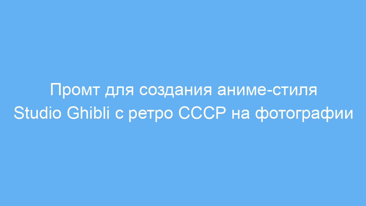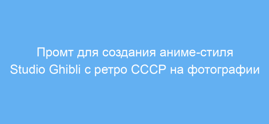Основная задача промта — превратить вашу фотографию в изображение в стиле знаменитых мультфильмов Studio Ghibli с добавлением элементов советской ретро-атмосферы. Таким образом, решается проблема создания необычного визуального контента без необходимости владелия сложными навыками рисования или работы в графических редакторах.