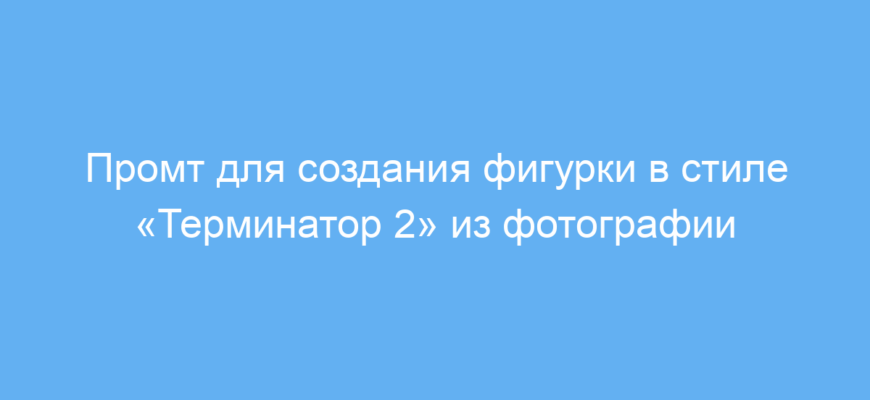 Этот промт предназначен для пользователей нейросетей, которые хотят быстро сгенерировать визуальное изображение пластиковой фигурки на основе личной фотографии в стилистике культового фильма «Терминатор 2: Судный день». Он помогает создавать уникальный художественный образ в индустриальном, холодном ключе с характерными деталями из фильма.