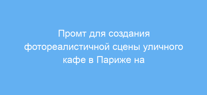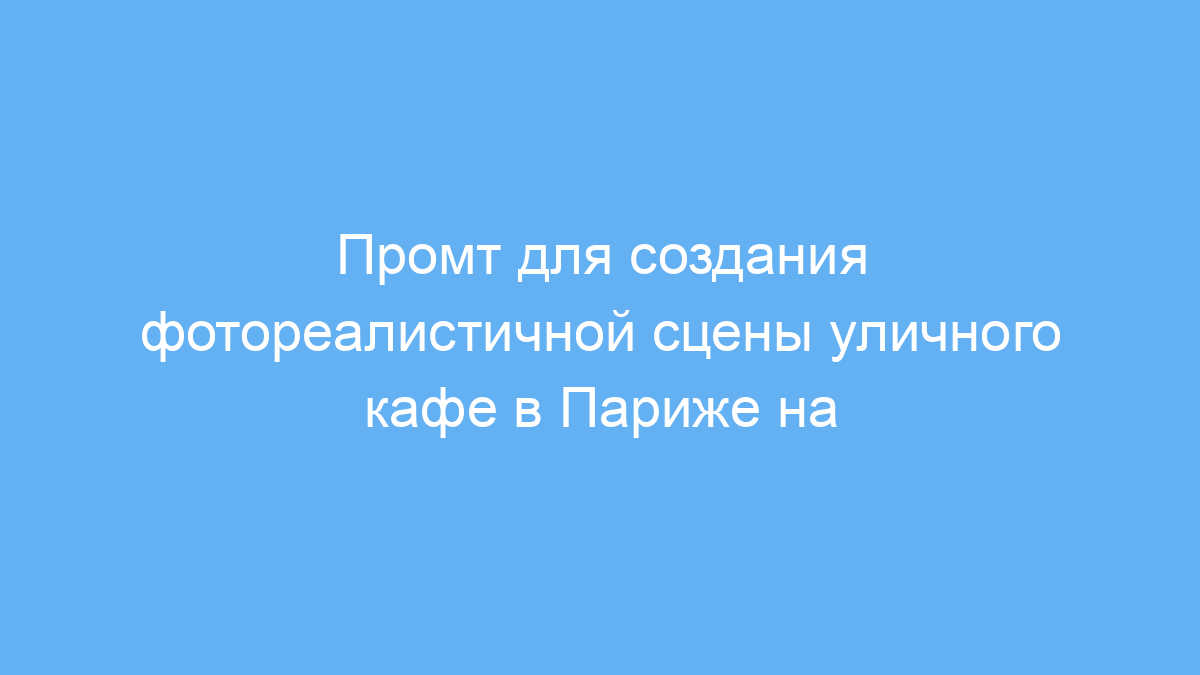 Этот промт предназначен для художников, дизайнеров, маркетологов и всех, кто хочет быстро получить качественное изображение уличного кафе в Париже на закате. Использование запроса экономит время на создание фотореалистичных визуализаций и помогает получить эффектные картинки с нужной атмосферой. Такой промт решает задачи создания реалистичных иллюстраций для рекламы, презентаций, социальных сетей и творческих проектов.