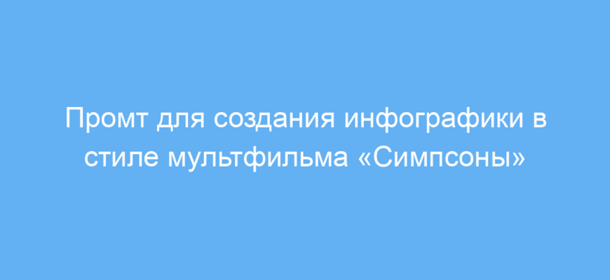 Этот промт пригодится дизайнерам, маркетологам, преподавателям и всем, кто хочет быстро получить яркую и запоминающуюся инфографику в мультяшном стиле. Он помогает создать изображение с жёлтыми тонами и упрощёнными формами, напоминающими знаменитых персонажей «Симпсонов», привнеся юмористический и лёгкий настрой в визуальный контент.