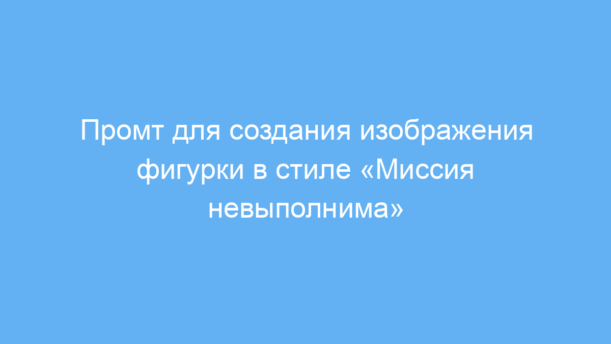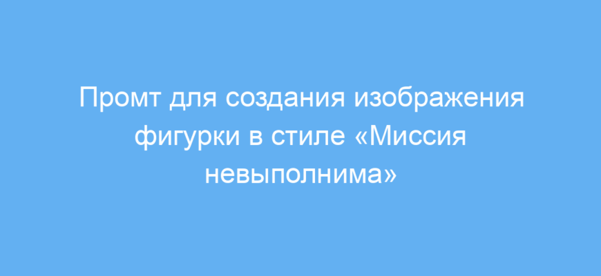 Данный промт предназначен для пользователей нейросетей, которые хотят быстро и точно получить уникальное изображение пластиковой фигурки на заданную тему — в данном случае, вдохновлённое «Миссией невыполнима». Это полезно дизайнерам товаров, геймдев-специалистам, создателям контента или любителям коллекционных фигурок, которым нужен качественный визуал без самостоятельного создания 3D-моделей или фотосессий.
