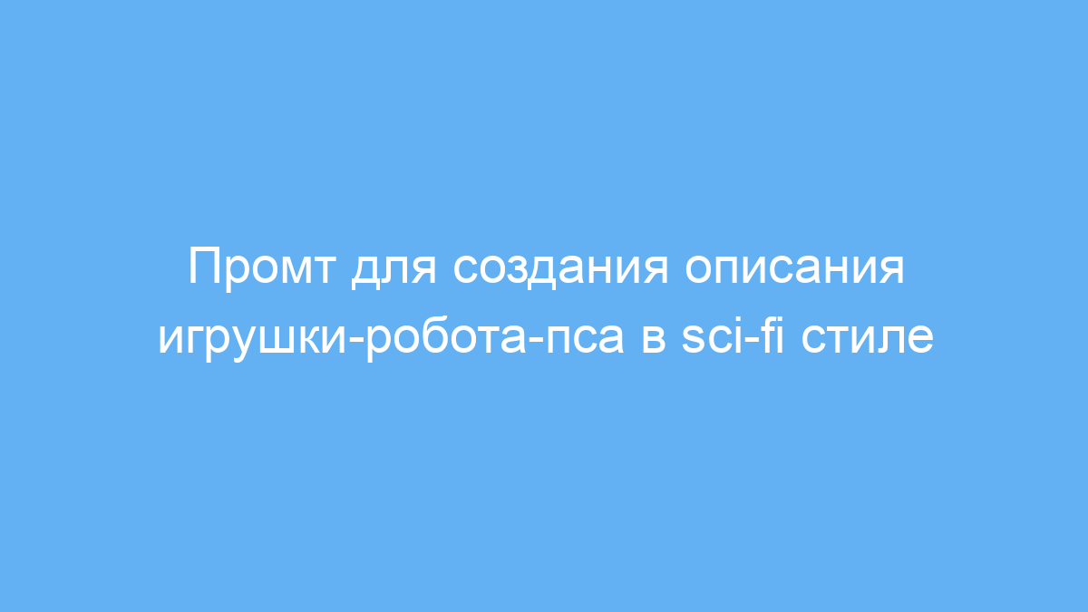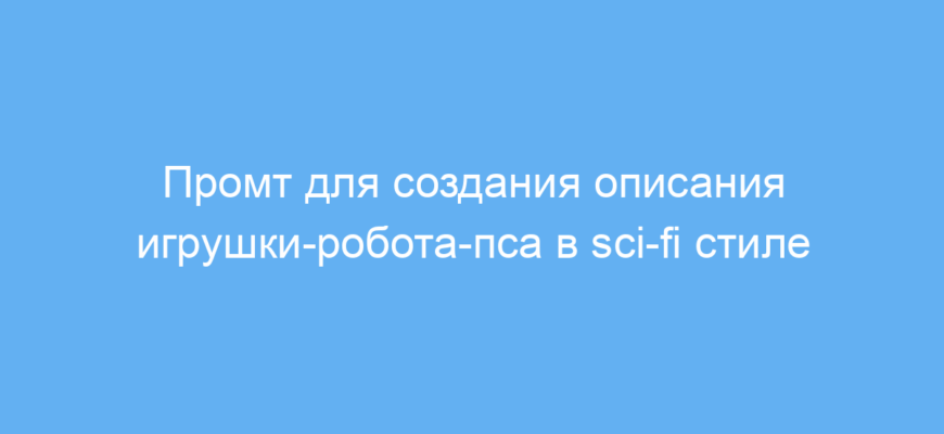 Этот промт предназначен для тех, кто хочет создать детальное и визуально насыщенное описание игрушки-робота-пса в стиле научной фантастики (sci-fi). Он помогает быстро и чётко сформулировать задание для нейронных сетей по генерации изображения или текста, где описан внешний вид и поза робота, а также наличие индивидуального кода доступа на ошейнике.