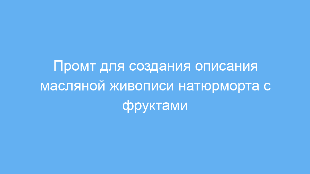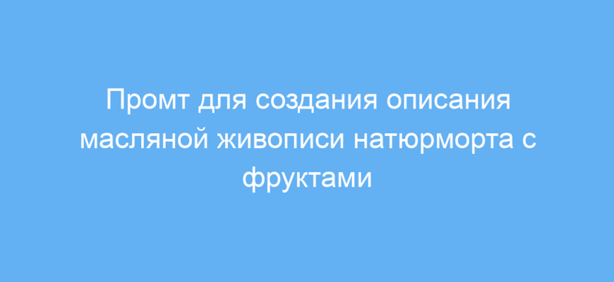 Этот промт предназначен для художников, дизайнеров, копирайтеров и всех, кто работает с нейросетями для генерации текстов или изображений. Он помогает создавать детализированные и атмосферные описания картин в классическом стиле, особенно масляной живописи натюрмортов с фруктами.