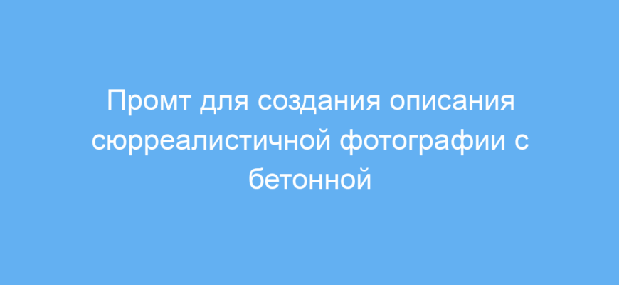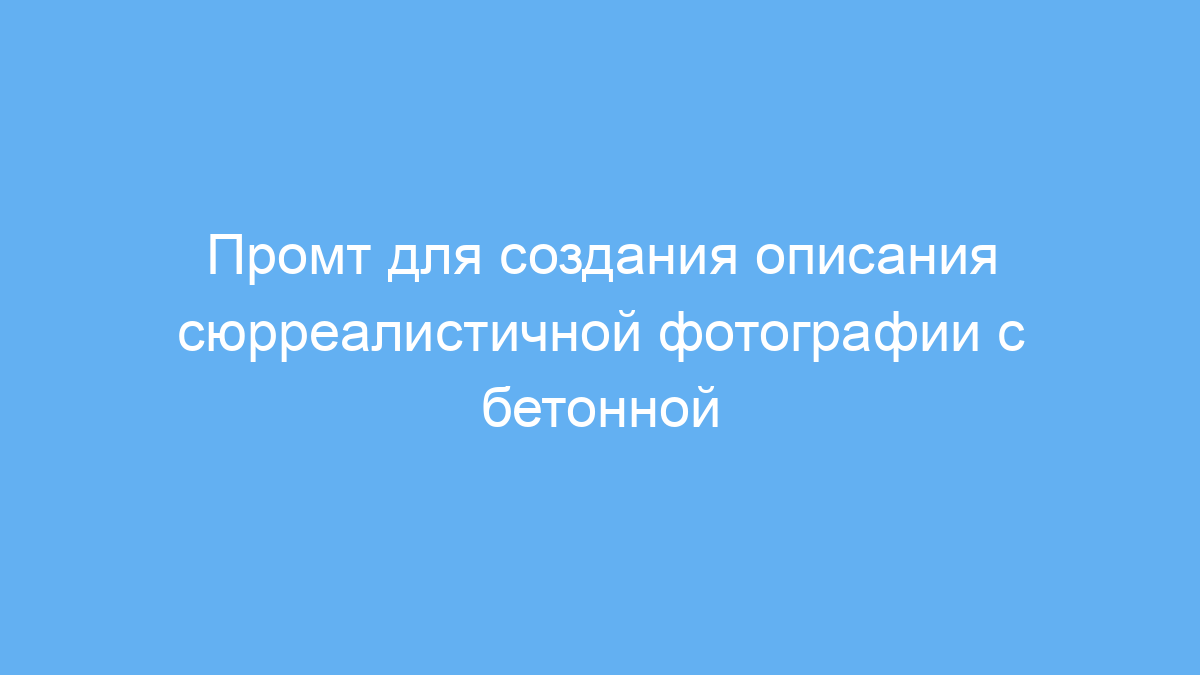 Этот промт предназначен для тех, кто хочет получить яркое и необычное описание фотографии в стиле сюрреализма. Он помогает создавать тексты, которые описывают абстрактные художественные образы — например, бетонную скульптуру человека, парящего над городом, с табличкой и надписью. Промт отлично подойдет художникам, фотографам, контент-менеджерам и всем, кто работает с визуальным искусством и хочет дополнить изображения оригинальным текстом.