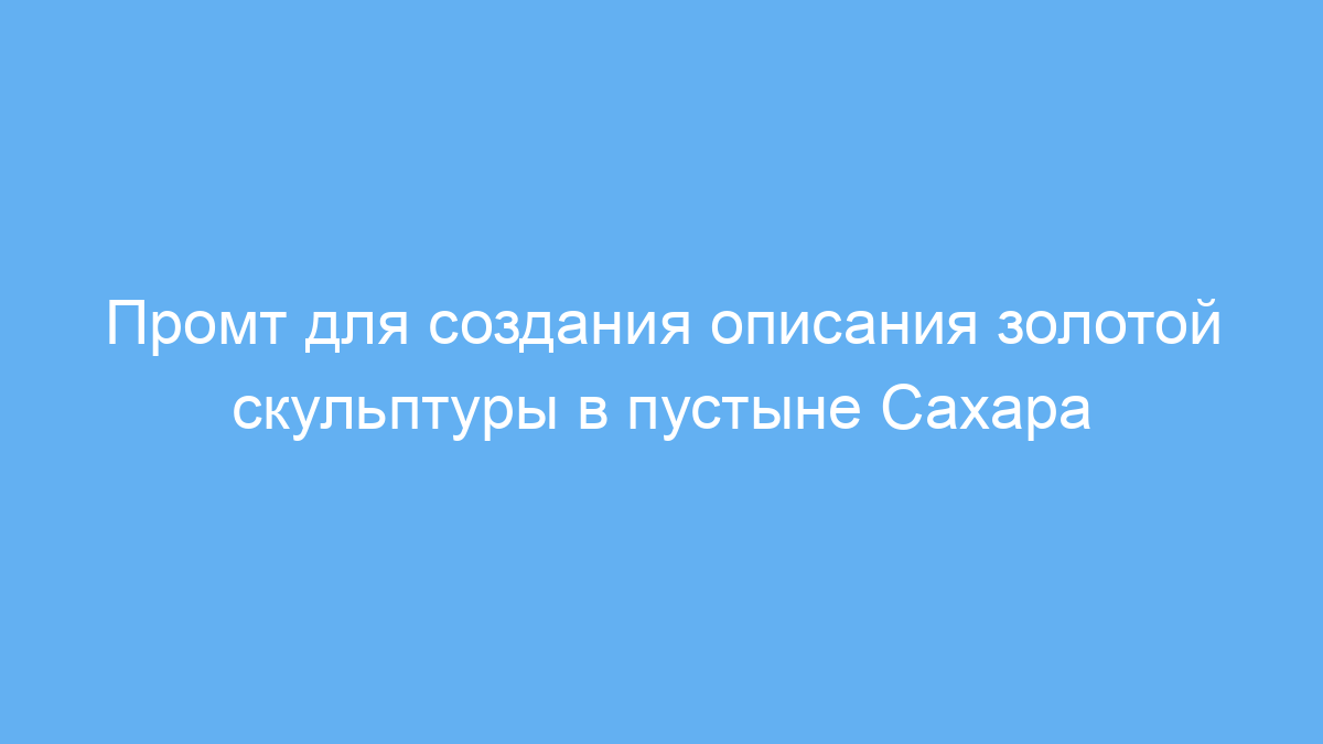 Этот промт предназначен для авторов контента, дизайнеров, маркетологов и всех, кто работает с нейросетями для генерации текстов и описаний. Он помогает создавать подробные и яркие описания необычных объектов — в данном случае, золотой скульптуры человека в центре пустыни Сахара. Благодаря промту вы получаете четкий и красочный текст, который можно использовать для презентаций, художественных проектов или креативных идей.