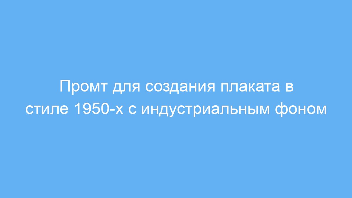 Этот промт предназначен для дизайнеров, маркетологов, контент-мейкеров и всех, кто хочет быстро получить готовое изображение плаката в художественном стиле 1950-х годов. Промт помогает создавать визуальный контент с индустриальным фоном и графиками роста, а также с текстом, подчёркивающим успехи, например, достижения пятилетки.