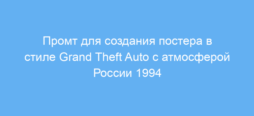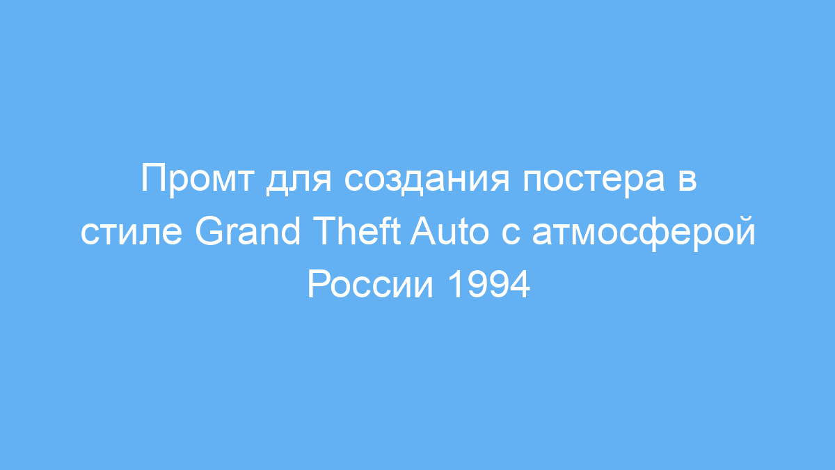 Этот промт будет полезен дизайнерам, иллюстраторам и любителям нейросетей, которые хотят быстро получить уникальный визуальный стиль, напоминающий игровую атмосферу Grand Theft Auto (GTA). Он решает задачу создания необычного арт-дизайна с эстетикой 90-х годов и российским колоритом, что часто сложно воспроизвести вручную из-за специфических деталей эпохи и локального окружения.