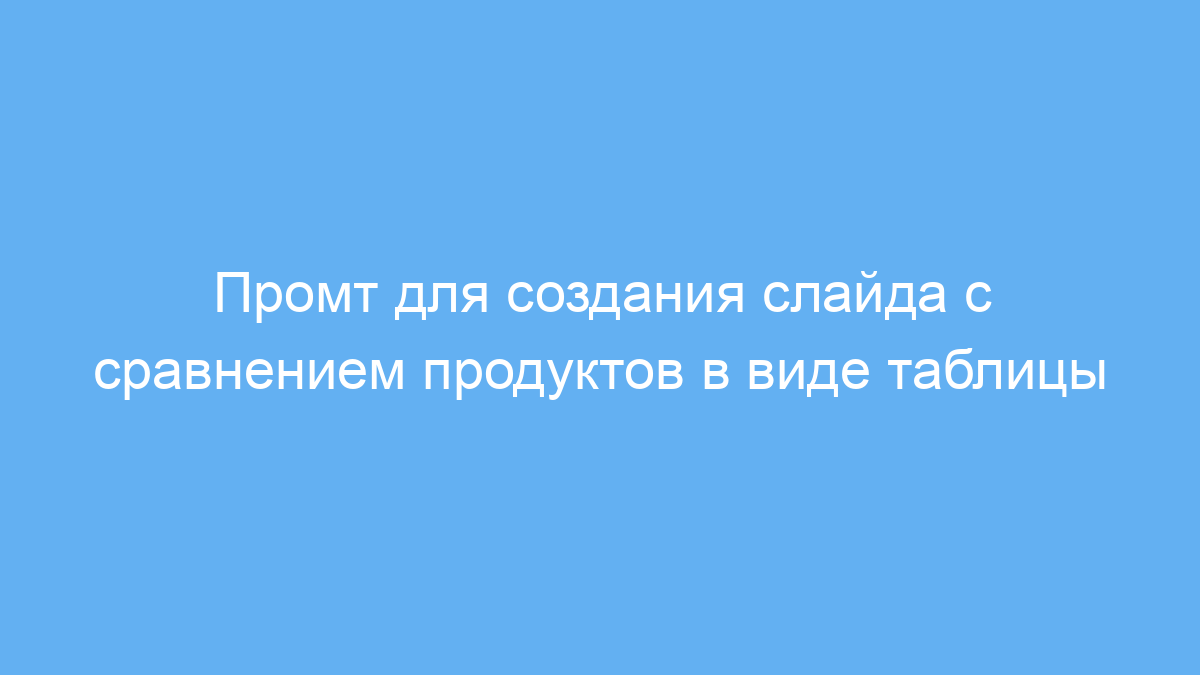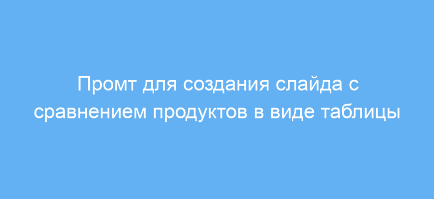 Для работы промта достаточно задать параметры сравнения, после чего нейросеть генерирует описание слайда, таблицу и дизайн-рекомендации. Это позволяет быстро получить готовую к использованию заготовку.