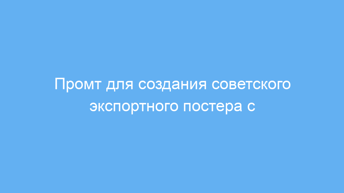 Этот промт предназначен для пользователей нейросетей, которые хотят быстро получить изображение в стиле советского экспортного постера 1970-х годов. Он будет полезен художникам, дизайнерам, маркетологам и всем, кто интересуется винтажным визуальным стилем с тематикой СССР. Основная задача промта — создать яркий, тематический арт с элементами советской символики, такими как золотой серп и молот, а также с промышленными объектами — нефтяными вышками и грузовыми кораблями. Это помогает сэкономить время на поиск референсов и дает четкие инструкции нейросети для получения нужного результата.