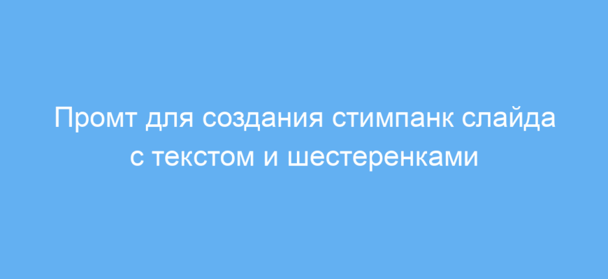 Этот промт предназначен для тех, кто хочет быстро создать эффектный слайд для презентации в стиле стимпанк. Он помогает оформить текст с использованием характерных элементов стимпанка — шестеренок и коричневой цветовой гаммы. Такой визуальный стиль подходит для проектов, связанных с техникой, ретрофутуризмом, научной фантастикой или просто необычным оформлением.