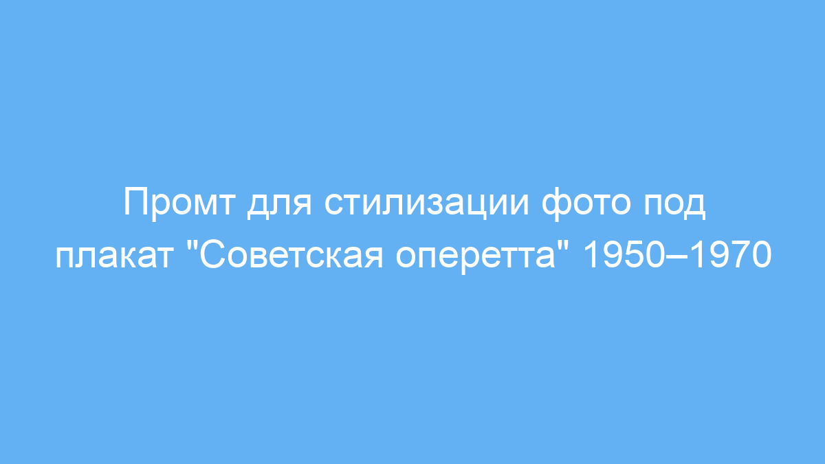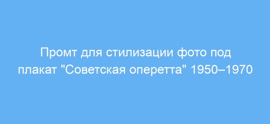 Этот промт предназначен для тех, кто хочет быстро преобразовать фото в стиле советских театральных плакатов эпохи 1950–1970 годов. Особенно полезен для дизайнеров, маркетологов, а также любителей ретро-стиля, которым нужно оформить изображения с артистами и нотами в духе советской оперетты. Он решает задачу создания аутентичной атмосферы советского искусства, подчёркивая театральную эстетику с использованием характерных шрифтов и визуальных элементов.