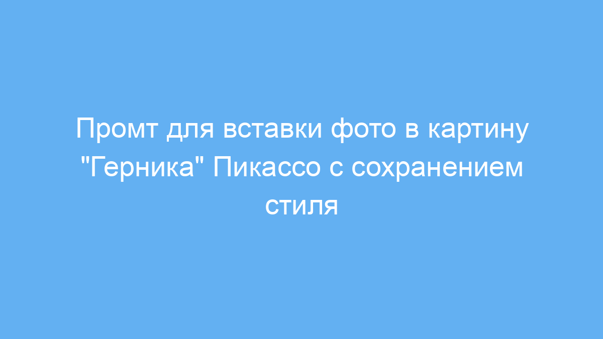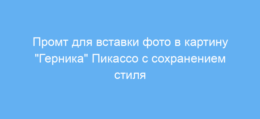Этот промт предназначен для пользователей нейросетей, которые хотят интегрировать собственное фото в известную картину «Герника» Пикассо. Он помогает получить изображение, сохраняющее уникальный стиль хаотичного кубизма, классическую чёрно-белую цветовую палитру и драматическую атмосферу оригинала.