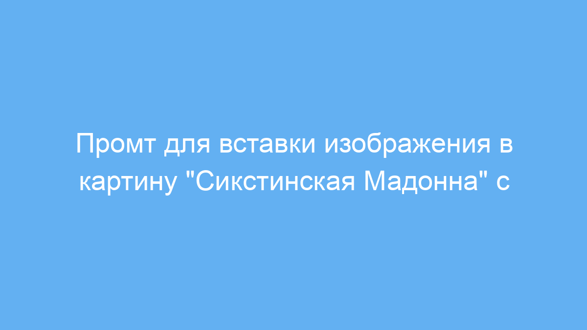 Этот промт создан для тех, кто хочет творчески интегрировать своё изображение в знаменитое произведение искусства — картину «Сикстинская Мадонна» Рафаэля. Он позволяет добавить пользователя или любое личное фото в классическую живопись, при этом дополняя композицию изображением ангелов и обрамляя центральный образ мягким религиозным сиянием. Такой подход помогает создавать уникальные арт-проекты, персонализированные открытки, а также креативный контент для соцсетей.