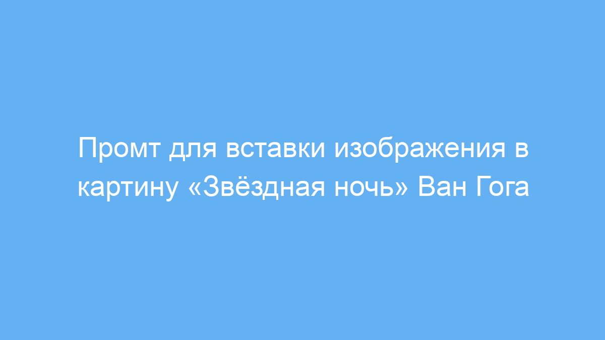 Этот промт предназначен для художников, дизайнеров и любителей нейросетей, которые хотят интегрировать собственные изображения в знаменитую картину Ван Гога «Звёздная ночь». Он помогает гармонично вписать заданный персонаж или объект в сюрреалистичный импрессионистский пейзаж с эффектом масляной живописи и сохранить узнаваемый вихревой стиль художника.