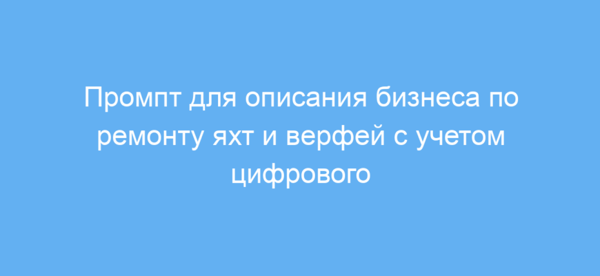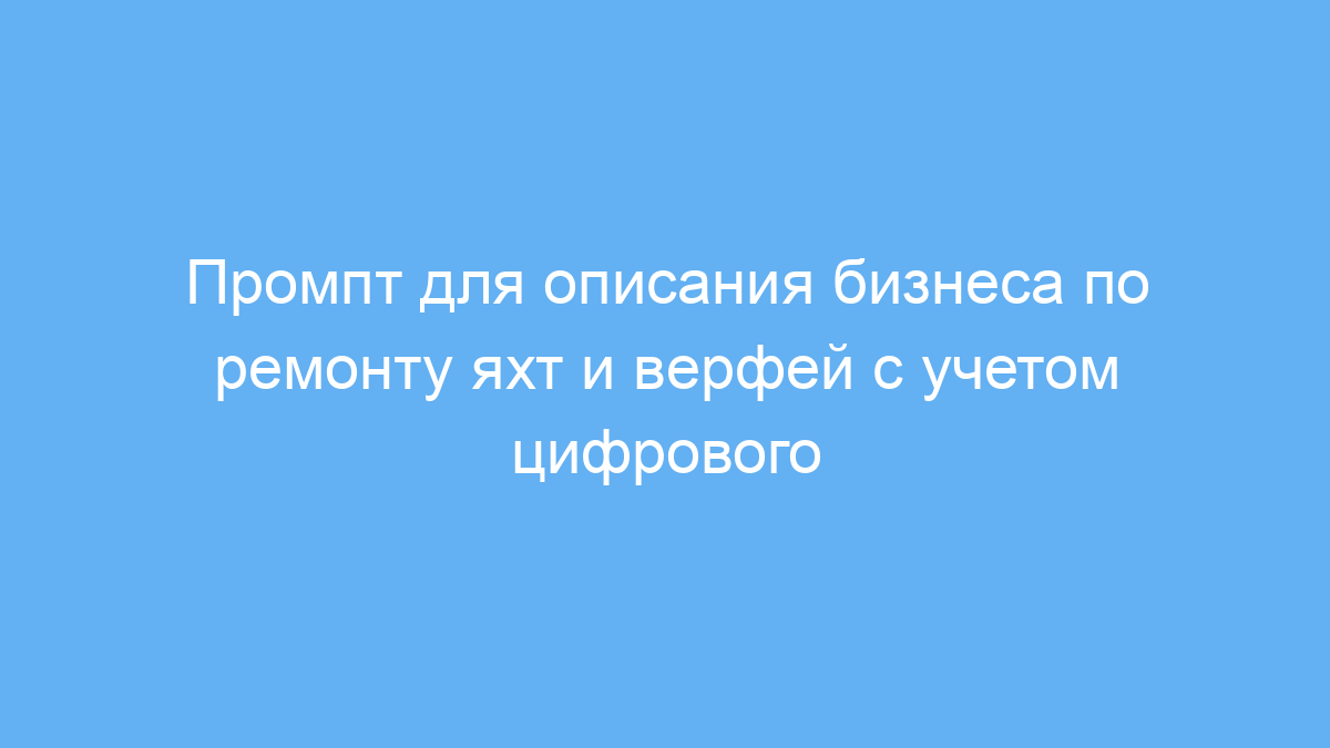 Этот промпт предназначен для маркетологов, копирайтеров и предпринимателей, работающих в сфере судоремонта, яхтенной индустрии и верфей. Он помогает быстро и структурировано создать абзац с основными аспектами бизнеса, учитывая отраслевые вызовы и возможности цифрового маркетинга.