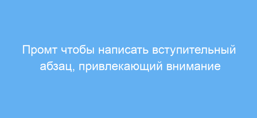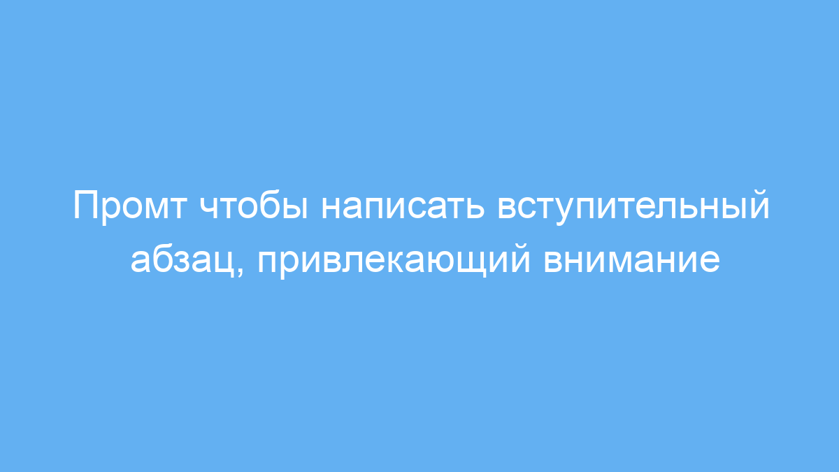 Этот промт предназначен для людей, которым нужно быстро и эффективно написать вводный абзац для статьи или другого текста. Он особенно полезен блогерам, копирайтерам, маркетологам и студентам, которые хотят заинтересовать читателя с самого начала и побудить его узнать больше о заданной теме. Часто создание цепляющего начала вызывает трудности — промт поможет решить эту проблему, генерируя убедительный и понятный текст.