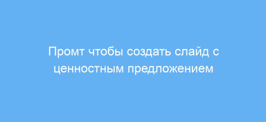 Этот промт предназначен для маркетологов, дизайнеров, владельцев бизнеса и всех, кто хочет быстро создать привлекательный слайд с ценностным предложением компании. Использование такого промта помогает грамотно и ясно донести главную выгоду или уникальность бренда, что важно для презентаций, рекламных материалов и продажи услуг или товаров.