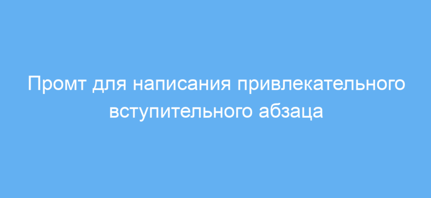 Этот промт позволяет быстро и легко создавать качественные вступительные абзацы, которые удерживают внимание читателей и повышают интерес к материалу. Используя его, вы экономите время и усилия, избавляясь от необходимости придумывать захватывающий текст самостоятельно.