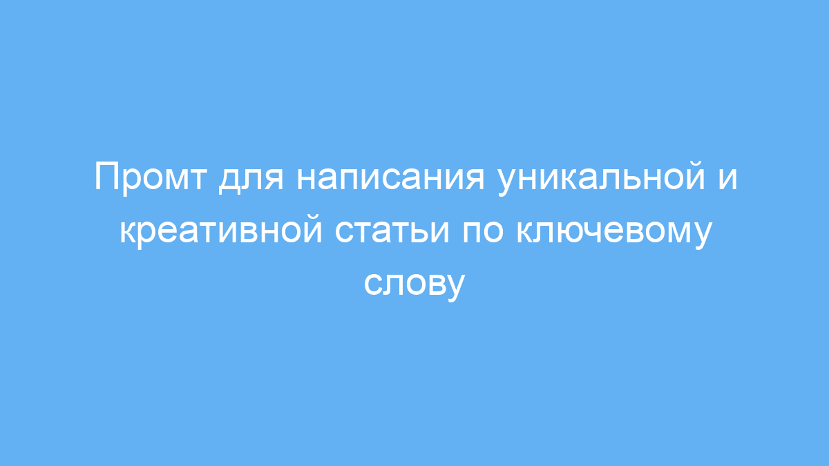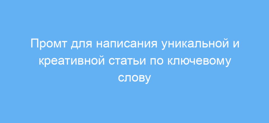 Этот промт создан для тех, кто хочет быстро и качественно получить уникальную, креативную и естественную статью на заданную тему с использованием ключевого слова. Он отлично подходит копирайтерам, блогерам, владельцам сайтов и маркетологам, которые стремятся публиковать интересный и SEO-оптимизированный контент без долгого и трудоемкого написания вручную.