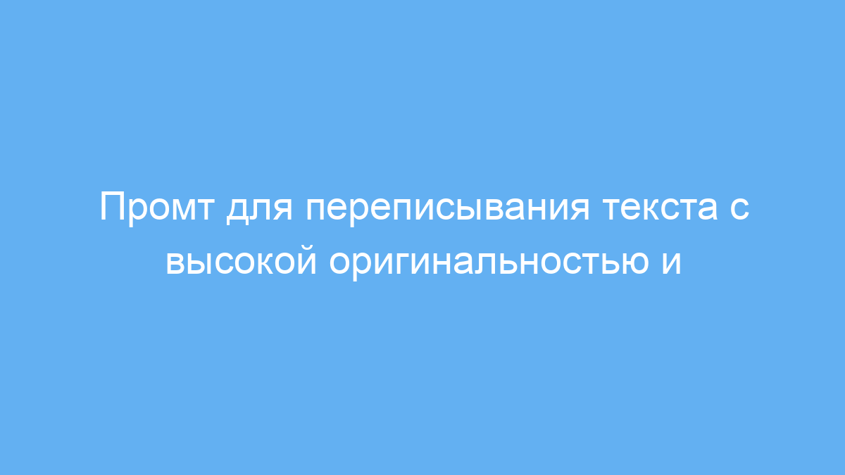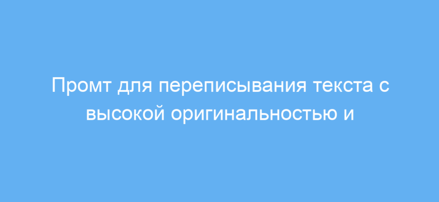Основная задача промта — повысить оригинальность и читабельность текста. С его помощью можно сделать ваш материал более привлекательным для читателей и поисковых систем, уменьшить риск плагиата, а также улучшить качество контента в учебе, работе или маркетинговых задачах.