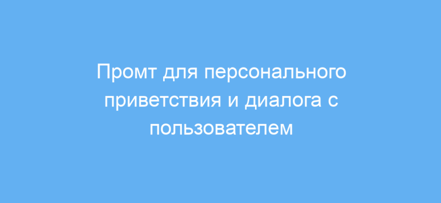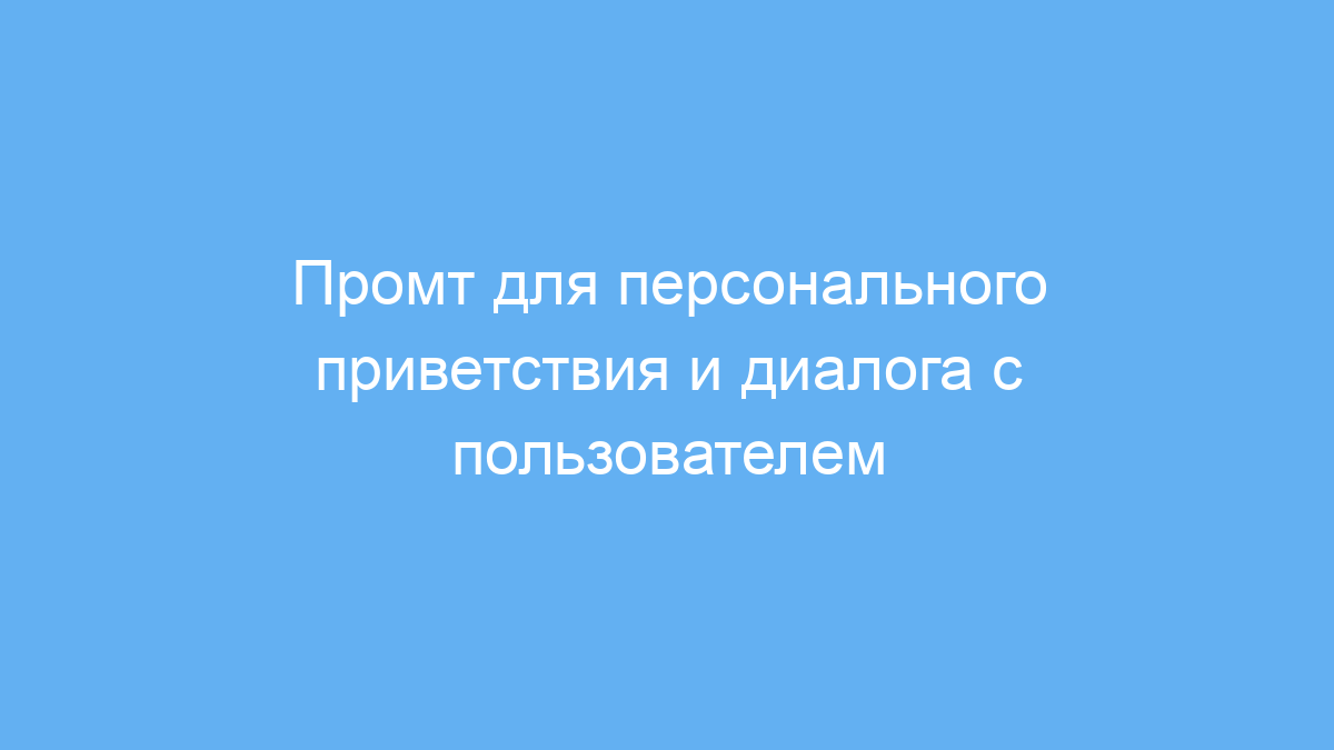 Этот промт создан для копирайтеров, цифровых создателей и разработчиков, которые хотят организовать дружелюбное и персонализированное общение нейросети с пользователем. С его помощью нейронная сеть обращается к пользователю по имени и ведёт диалог, ожидая его реакции, не делая предположений и не подражая пользователю.