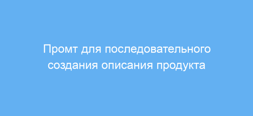 Работает промт по шагам: сначала задаются базовые вопросы о продукте и его характеристиках, затем выявляются уникальные преимущества и целевая аудитория, после чего формируется черновик описания для обратной связи. В финале — итоговый текст с доработками и экспертной проверкой.