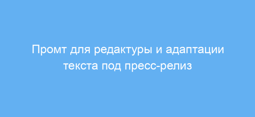 Работает промт через четко сформулированные параметры: пользователь задаёт роль редактора, цель редактуры, тип организации, тональность, тему и аудиторию. Искусственный интеллект затем выполняет адаптацию исходного текста под эти требования, создавая готовый к публикации пресс-релиз.