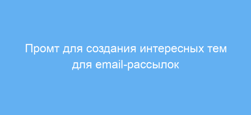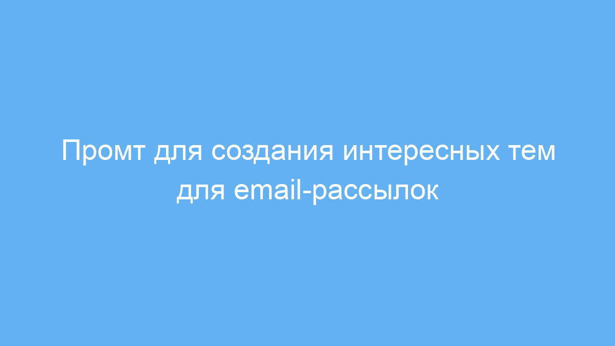 Промт решает проблему поиска свежих и релевантных тем для email-рассылок, что часто занимает много времени и требует творческого подхода. С его помощью можно быстро собрать идеи, которые отвечают интересам целевой аудитории.