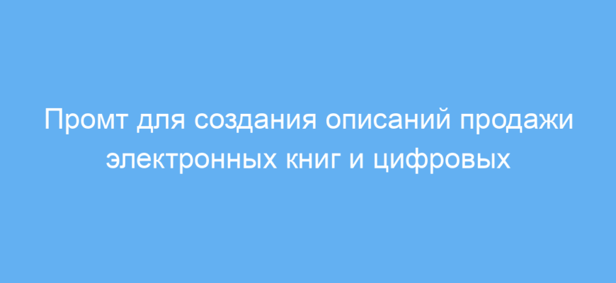 Этот промт предназначен для предпринимателей, маркетологов и владельцев интернет-магазинов, которые продают электронные книги и другие цифровые товары. С его помощью легко создавать привлекательные описания для продуктов, которые помогают увеличить продажи и заинтересовать покупателей.