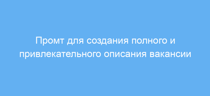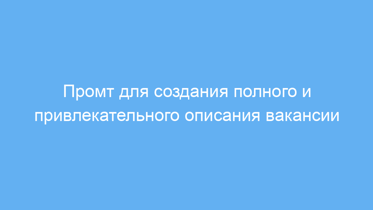 Используя данный промт, вы экономите время на создании структурированных и привлекательных описаний вакансий. Это упрощает взаимодействие с кандидатами и помогает быстрее находить нужных специалистов благодаря грамотной подаче информации.