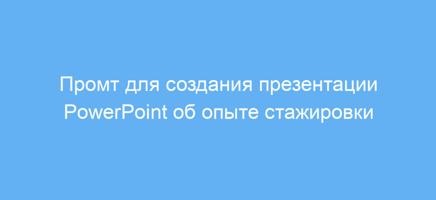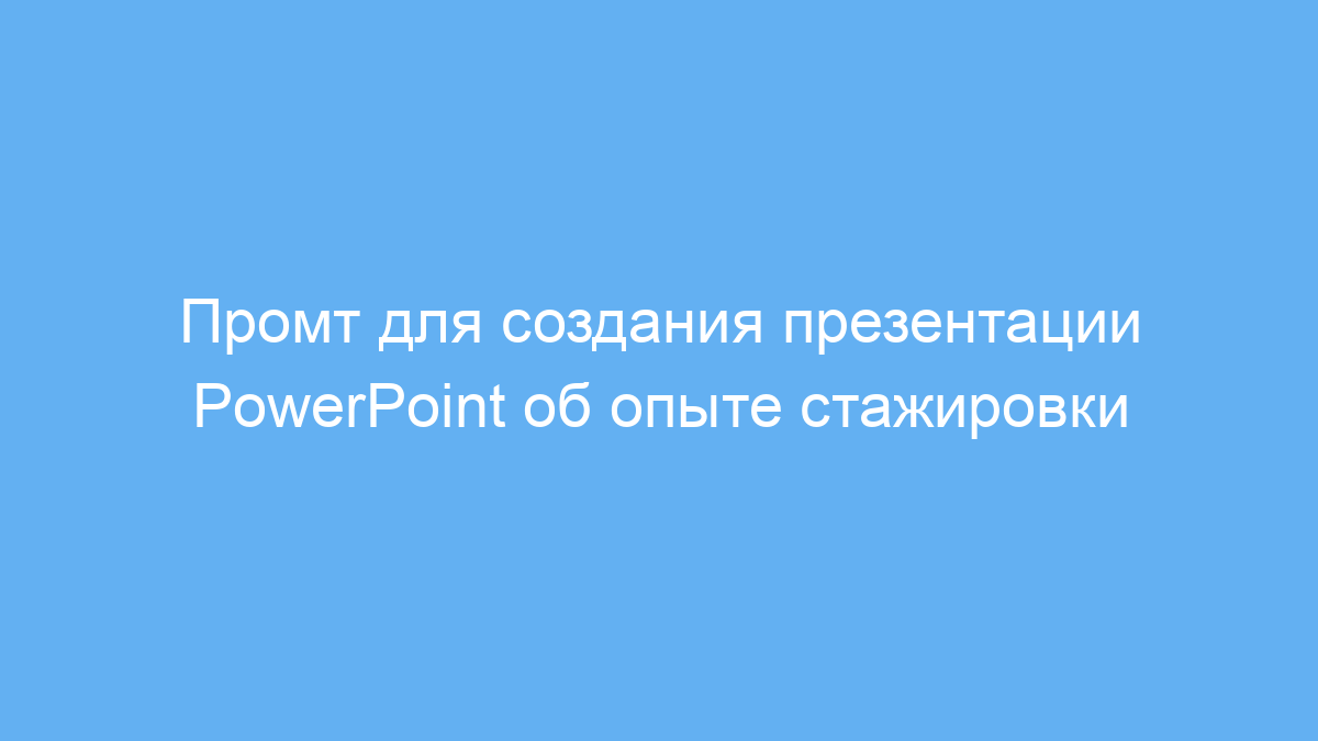 Этот промт предназначен для тех, кто хочет быстро и качественно подготовить презентацию о своём опыте стажировки или работы. Он помогает структурировать информацию и представить её в удобном формате для PowerPoint. Если вы стажировались в компании, участвовали в различных проектах или проводили исследования, такой промт значительно ускорит создание презентации и избавит от необходимости придумывать структуру с нуля.