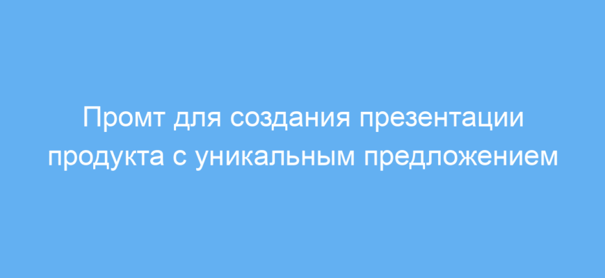 Этот промт значительно облегчает создание профессиональной и привлекательной презентации продукта, позволяет быстро выделить уникальное торговое предложение и представить его в ясном, понятном стиле. Вы экономите время и получаете качественный контент, который эффективно поддержит маркетинговые задачи.
