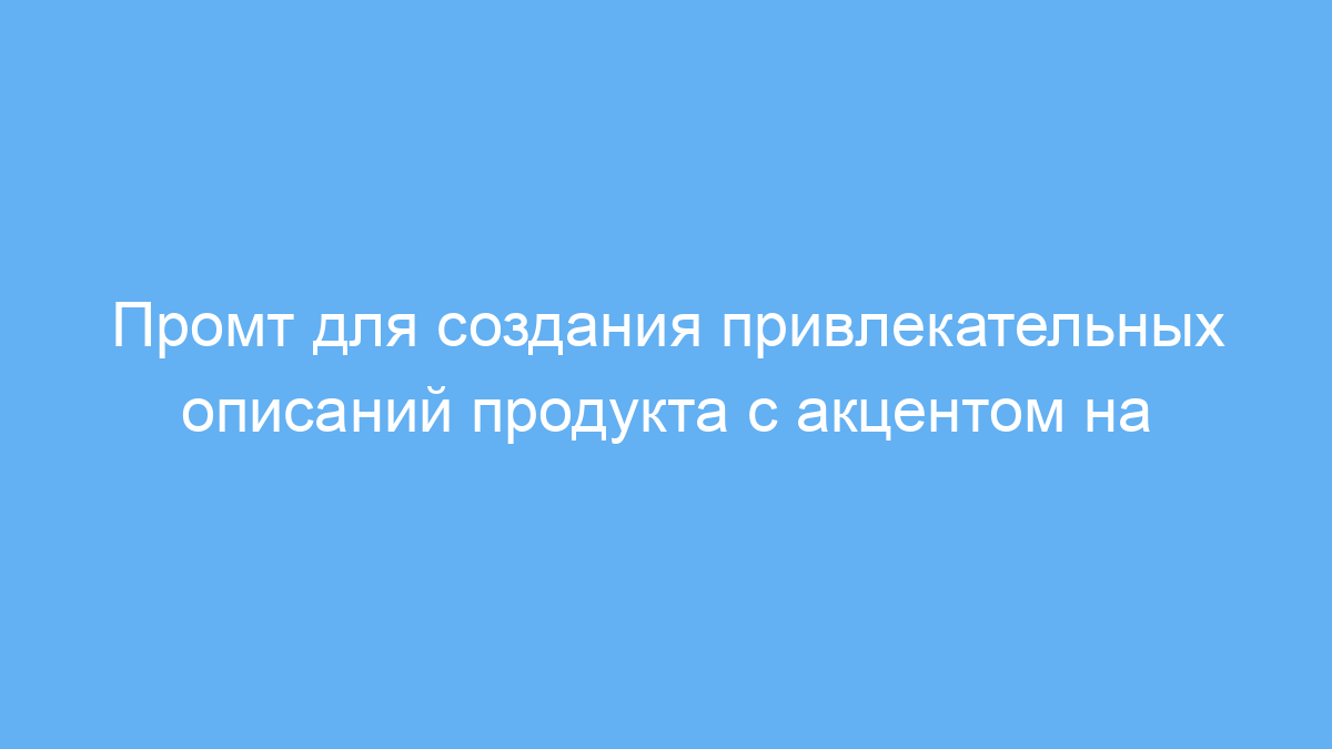 Использование промта сэкономит ваше время при создании качественных маркетинговых текстов с чётким акцентом на преимущества товара. Это помогает повысить заинтересованность клиентов и улучшить конверсию без лишних усилий и творческих затрат.