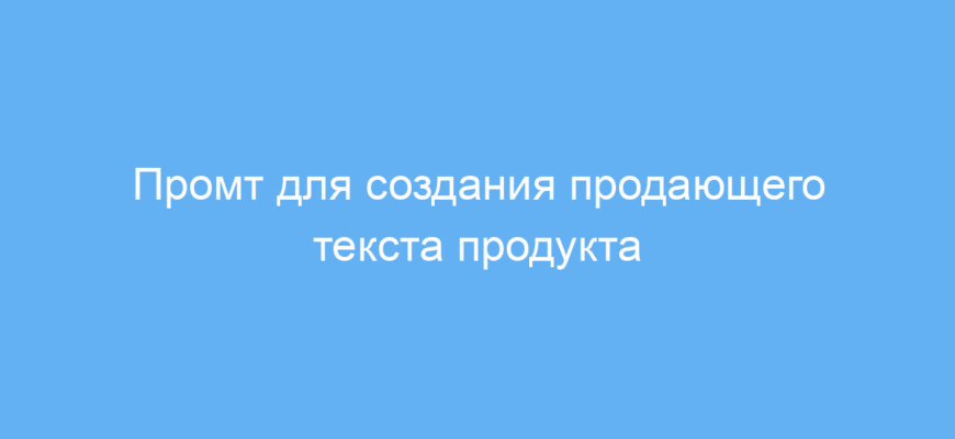Промт помогает решить проблему нехватки времени и идей на написание продающих описаний. Вместо того чтобы думать над структурой и формулировками, вы просто вводите название продукта, его назначение или проблему, которую он решает, а нейросеть генерирует текст, который легко привлекает внимание и побуждает к действию.