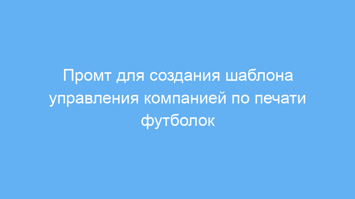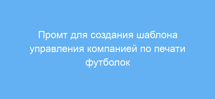 Этот промт предназначен для предпринимателей и стартаперов, которые хотят организовать эффективное управление компанией по печати футболок под заказ. Он помогает структурировать основные этапы бизнес-процесса — от выбора ниши до обслуживания клиентов.