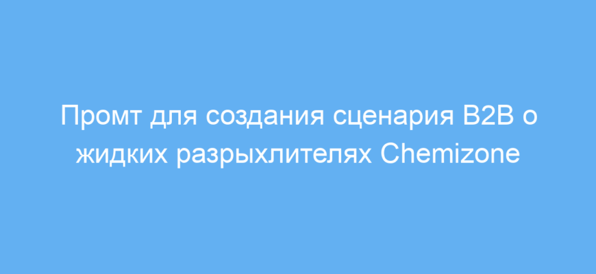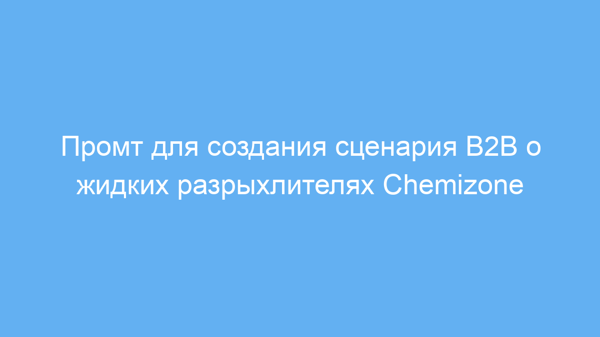 Этот промт предназначен для копирайтеров, маркетологов и специалистов по контенту, которым необходимо создать убедительные и структурированные тексты для B2B-сегмента автомобильной индустрии. В частности, он помогает написать сценарии, презентации или рекламные материалы о продукции Chemizone — жидких разрыхлителях для ухода за автомобилями.