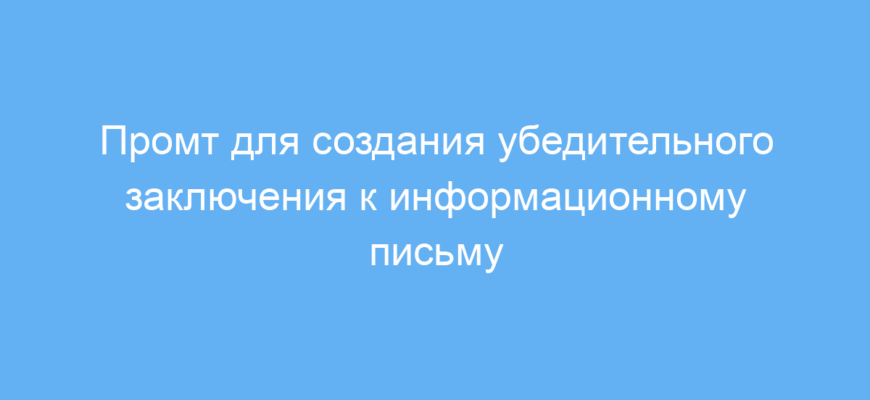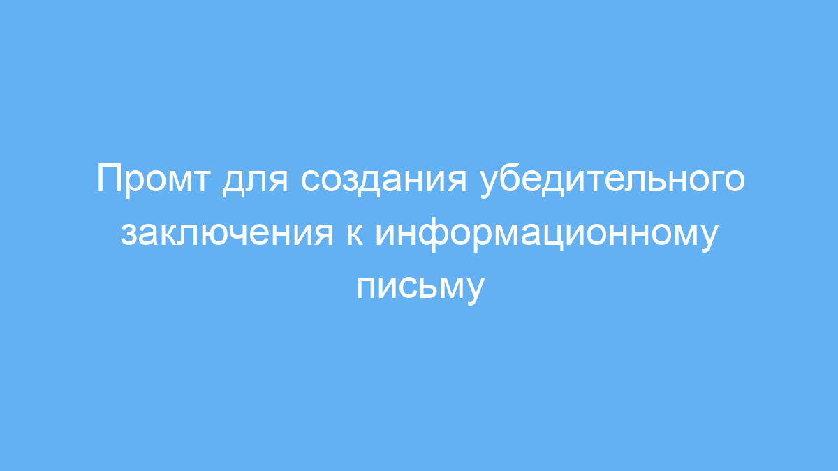 Этот промт значительно упрощает задачу написания убедительного заключения, делая текст лаконичным и мотивирующим для читателя. Он помогает ускорить подготовку информационных писем, сохраняя высокий уровень вовлечённости аудитории и повышая шанс конверсии.
