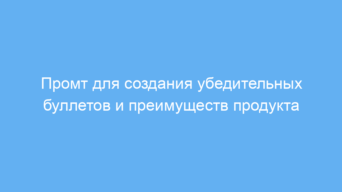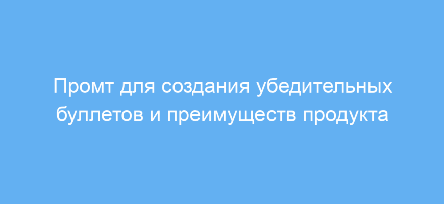 Этот промт предназначен для маркетологов, копирайтеров и владельцев бизнеса, которые хотят создавать яркие и цепляющие буллеты (ключевые преимущества продукта). Он помогает выделить уникальные достоинства и выгоды товара, чтобы привлечь внимание потенциальных клиентов и повысить продажи.