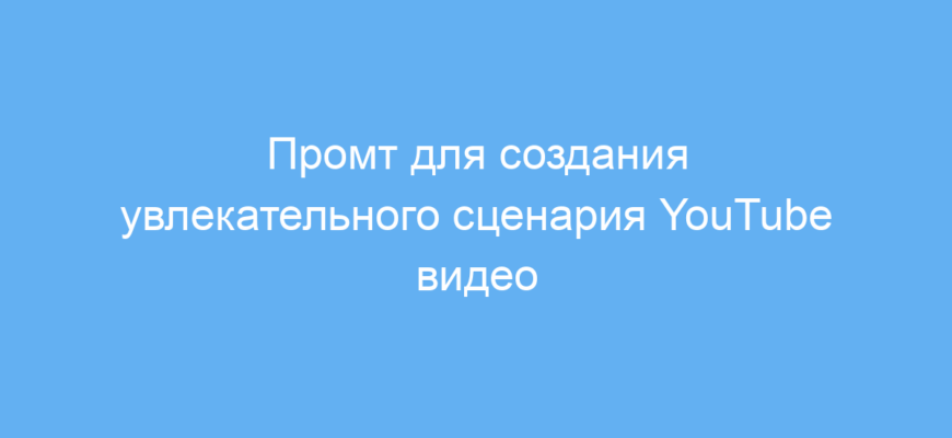 Данный промт предназначен для авторов видео, блогеров и маркетологов, которые хотят быстро получить готовый сценарий для YouTube ролика. Он помогает создавать увлекательный и информативный текст, адаптированный под интересы конкретной аудитории.