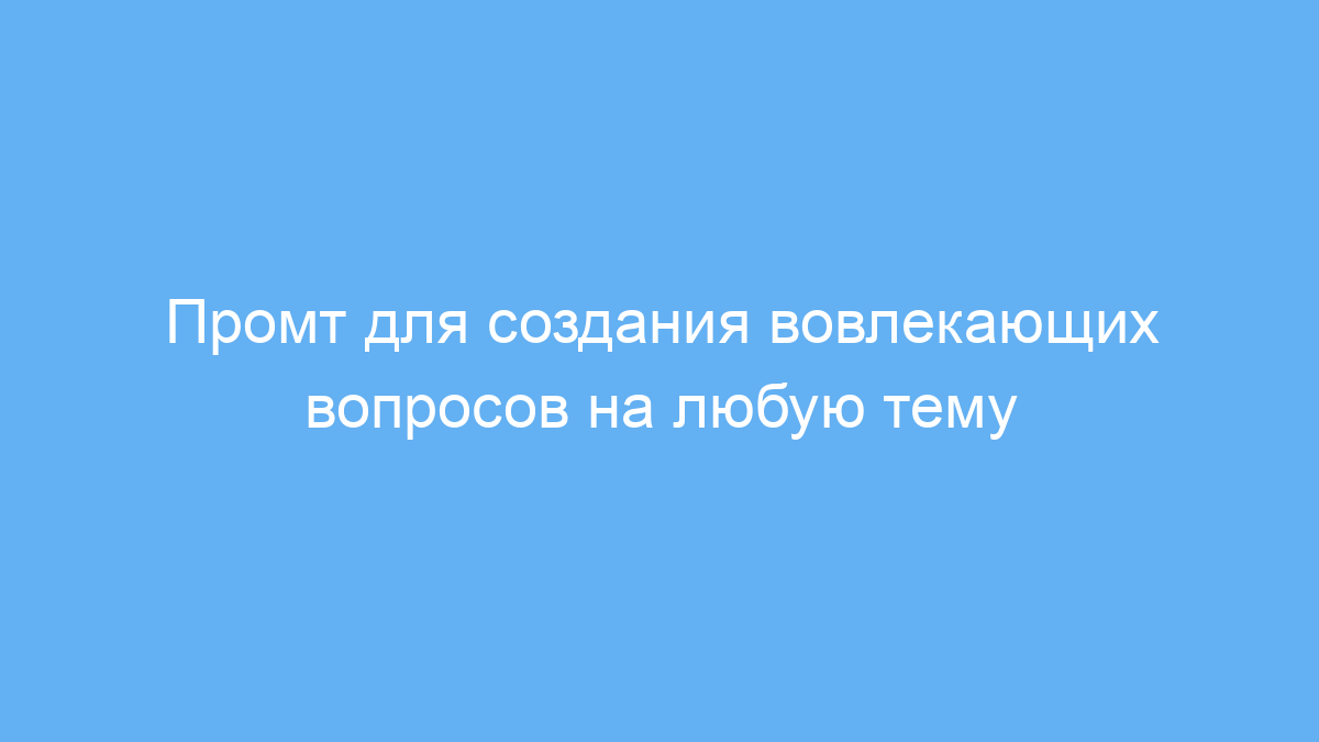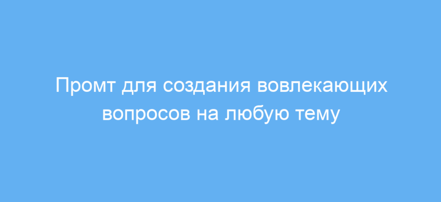 Проблема многих авторов — сложность найти интересные и глубокие вопросы, которые стимулируют диалог. Этот промт решает эту проблему, генерируя серию продуманных вопросов по вашей теме, что помогает удержать внимание и сделать контент более интерактивным.
