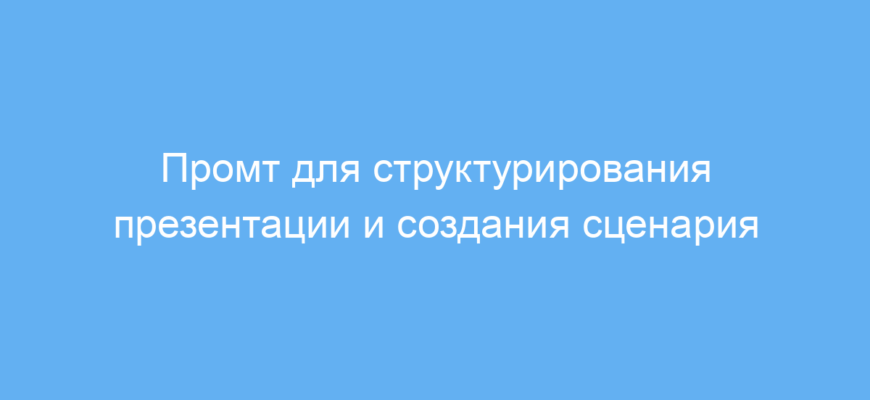 Этот промт предназначен для всех, кто готовит презентации и хочет сделать их понятными, логичными и эффективными. Особенно он полезен контент-менеджерам, маркетологам, преподавателям и специалистам по продажам. Используя этот промт, вы быстро создадите четкий план презентации и получите сценарий с заметками для выступающего, что экономит время и улучшает качество подачи материала.