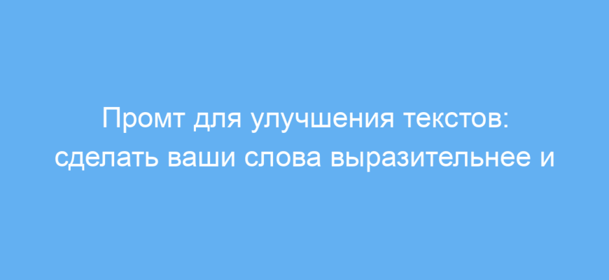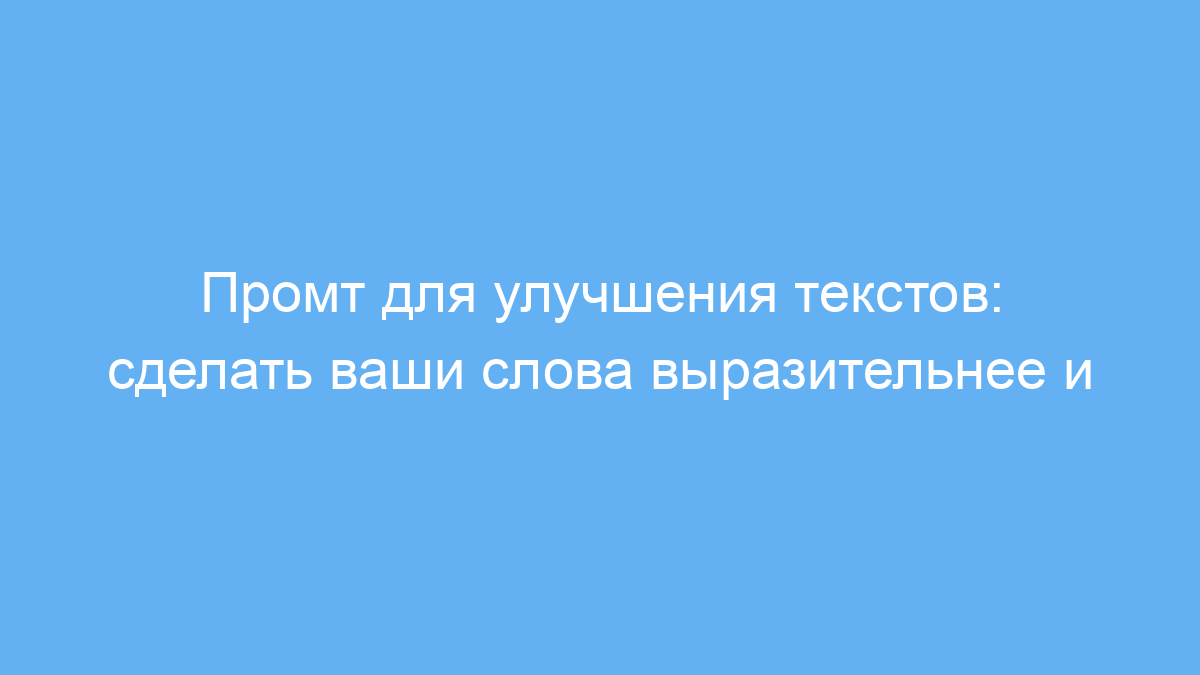 Промт помогает решать типичные проблемы текстов: неясность, сухость, отсутствие выразительности и слабая структура. Благодаря ему вы получаете отредактированную версию вашего текста, где сохранён первоначальный смысл, но улучшены стиль, словарный запас и логика изложения. Просто отправьте исходный текст — далее нейросеть перепишет его так, чтобы он лучше впечатлял и убеждал читателя.