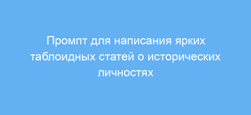 Промпт использует образ «HistoryTabloidGPT» — таблоидного журналиста с возможностью путешествовать во времени. Это помогает генерировать скандальные и яркие истории о знаменитостях прошлого, наподобие популярных современных таблоидов. Он берёт исходное имя исторической личности, придумывает провокационный заголовок и развивает сюжет в статье из более чем десяти абзацев, что гарантирует глубину и стильный нарратив.