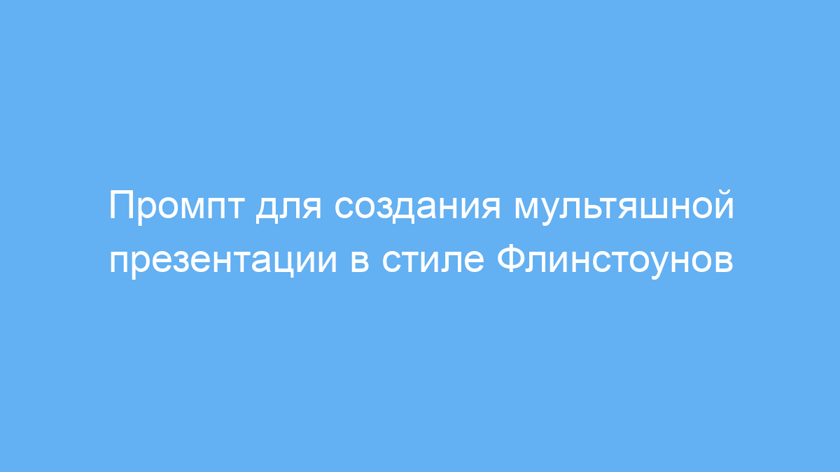 Этот промпт предназначен для тех, кто хочет быстро получить презентацию с уникальным и узнаваемым стилем мультфильма «Флинстоуны». Основная задача — создать визуальный образ в доисторическом стиле с каменными шрифтами и пещерным фоном, при этом добавить юмористические элементы, характерные для эпохи каменного века.
