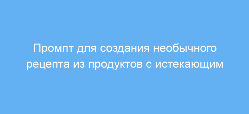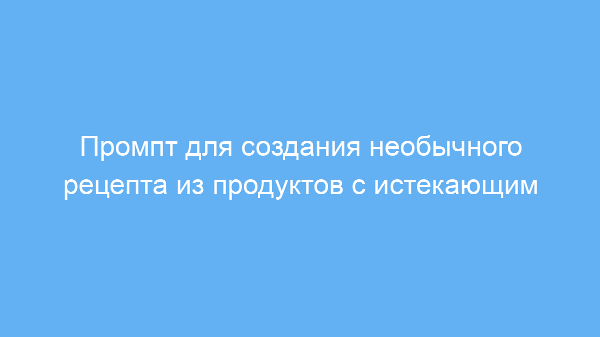 Принцип работы промпта заключается в том, что вы даёте нейросети список доступных продуктов с указанием количества и оставшегося срока годности. Нейросеть генерирует необычный, но вкусный рецепт, подчёркивая использование продуктов, срок годности которых близок к окончанию. Так вы получаете практическое и креативное решение прямо «на лету».